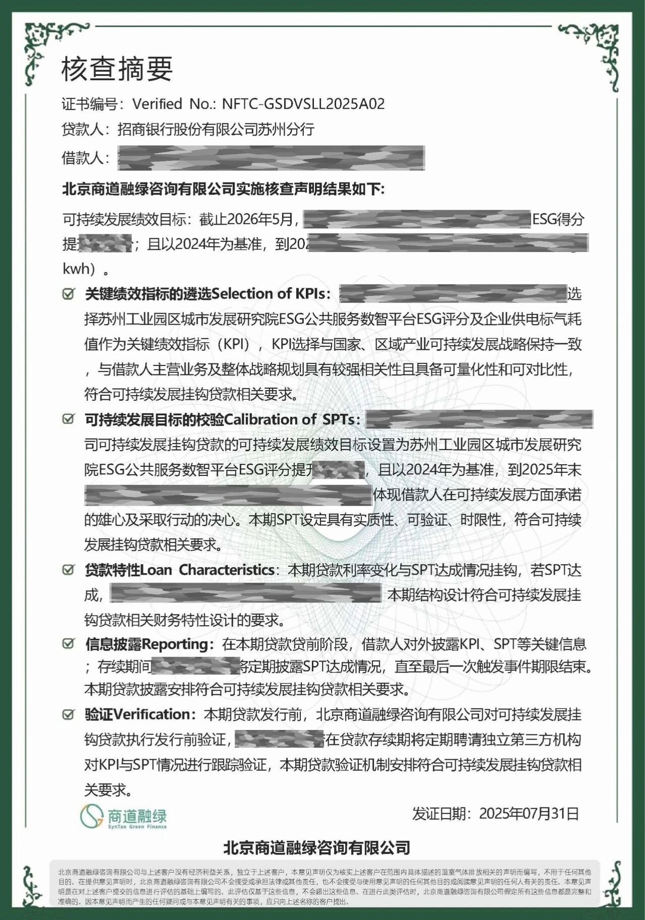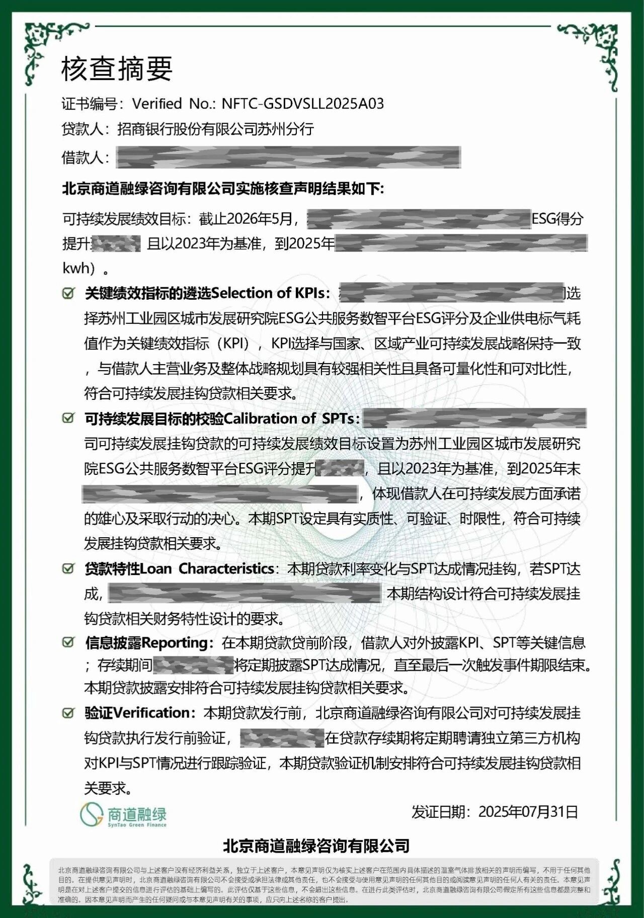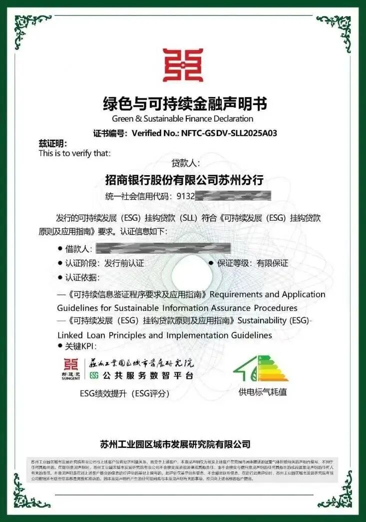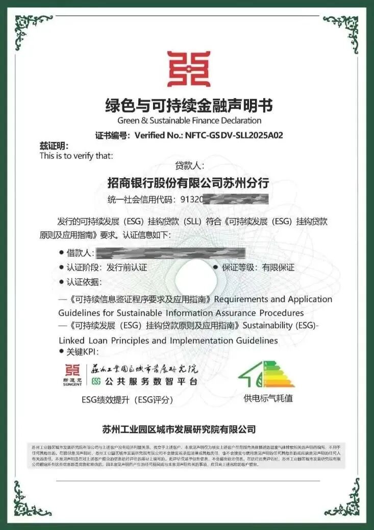 园区城发院为该笔贷款是否符合可持续挂钩贷方法学进行认定,出具《绿色与可持续金融声明书》。