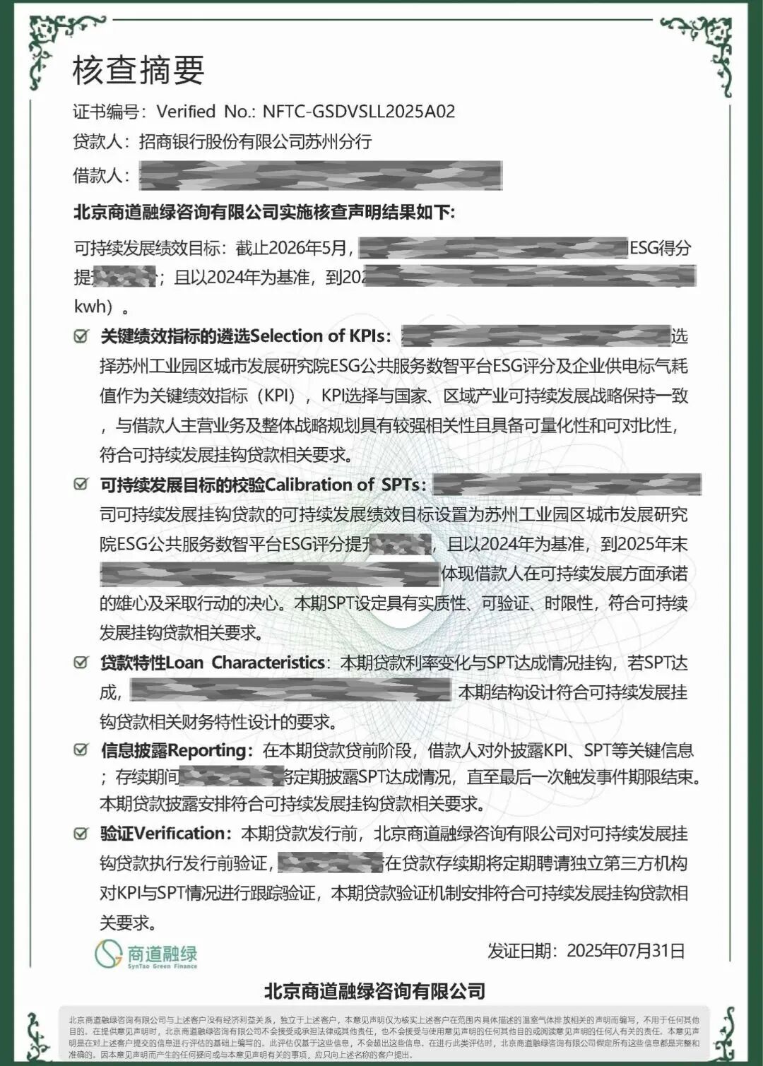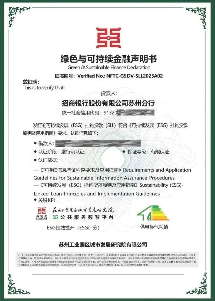最近,商道融绿协助苏州工业园区城市发展研究院、招商银行苏州分行落地两笔“ESG平台-核查”一站式可持续双挂钩(SLL)贷款。这笔贷款挂钩了两个指标,一是公共服务数智平台的ESG评分,二是借款企业的供电标气耗值。若企业指标改善,则银行提供优惠,由此形成“以绩效促发展、以金融助转型”的机制。(详情:融绿新闻|商道融绿协助苏州园区城发院、招行落地两单SLL
