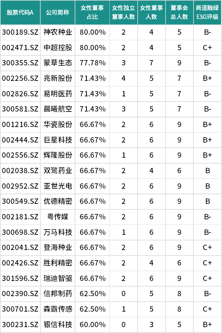 在深交所女性董事占比排名前20的公司中,电气机械、计算机、通信和其他电子设备制造业占据5席,运输设备和通用专用设备制造业占据4席,医药制造业占据3席——这三个行业包揽了前20名中的12个席位,成为头部公司最集中的行业来源。神农种业、中超控股以80%的女性董事占比并列榜首,蒙草生态以77.78%紧随其后。